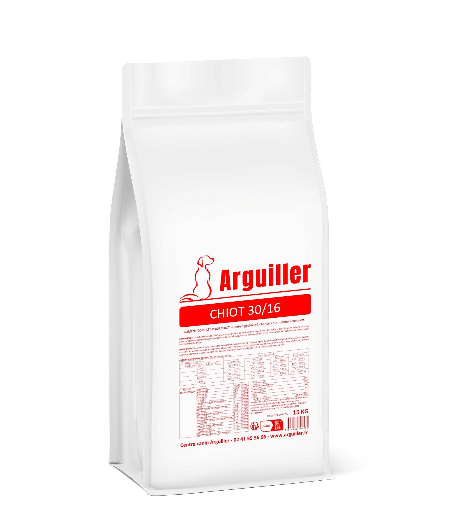Formulé sans blé ni maïs, cet aliment complet convient à toutes les races de chiots de 1 à 12 mois, pour un développement sain et équilibré.